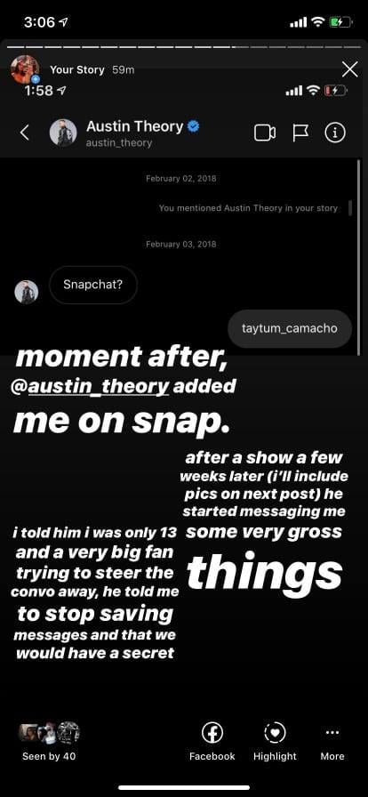 She said that she met Theory at a show, where he made her feel uncomfortable by pulling her closer to him more than she wanted. She further added that Theory sent her gross messages when she added him on Snapchat, and told her to not save messages (implying that he wanted to talk gross stuff and not get caught).