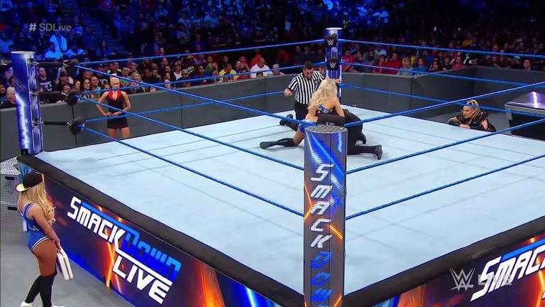 Tamina and Charlotte lock up. Waistlock by Charlotte and Tamina connects with an elbow. Tamina bounces Charlotte’s head off the turnbuckle and Charlotte returns the favor and connects with a chop. Charlotte works on the arm but Tamina reverses it. Slam countered by Charlotte and Charlotte with