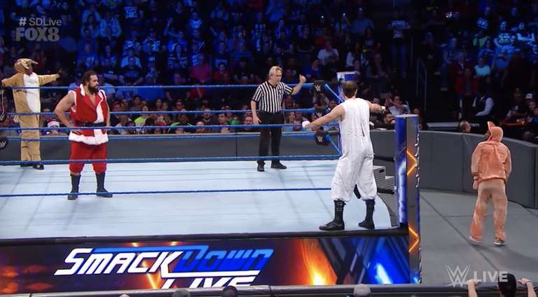 English with an armdrag and Rusev tags in double irish whip and Kingston slides out of the ring making a fool of Rusev and Santa Rusev chases after him. Aiden The Snowman eats a dropkick Xavie hands Big E and Kingston the toy